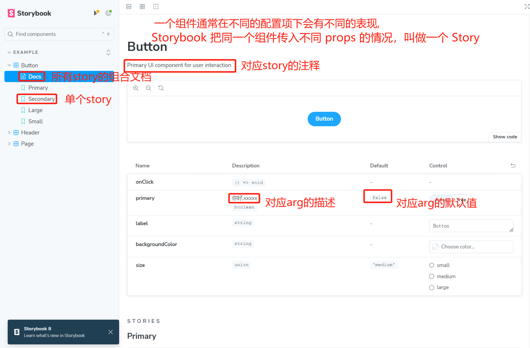 | decorators:[(Story)=>jsx] | 用于添加一些额外样式, 例如在 Story 组件外部包裹一层 margin, Story 就是我们写的各个接受完参数的story组件, 例如 Button 组件的 primary |