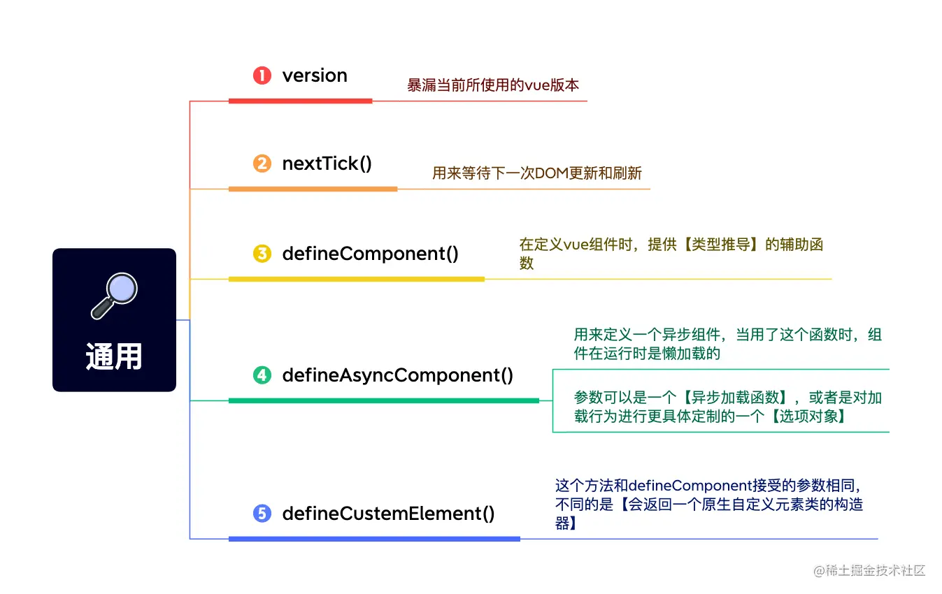- 全局API的调整:Vue 3中全局API的使用方式有所变化。例如,