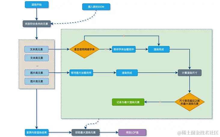 计算方式是从网页开始渲染到渲染完成,每次渲染内容都对比下大小,如果是更大的内容,就更新下 LCP 的值: