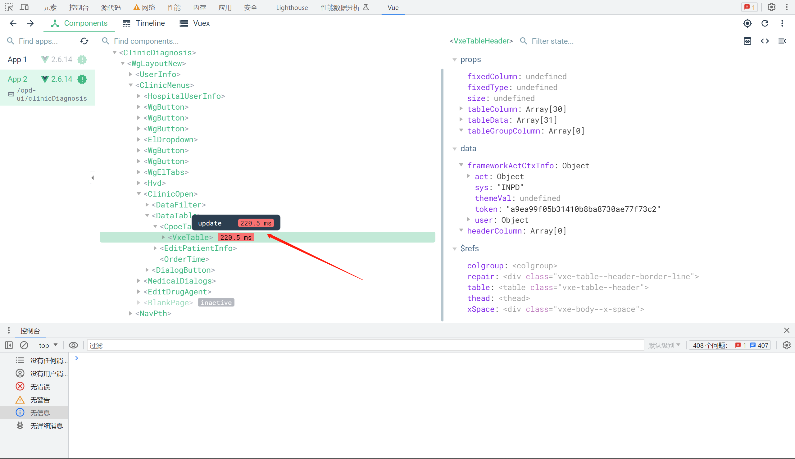 下图可以看出来,VxeTable这个组件被标红了,并且显示了具体的时间,以及每个阶段的耗时,此处是update耗时。