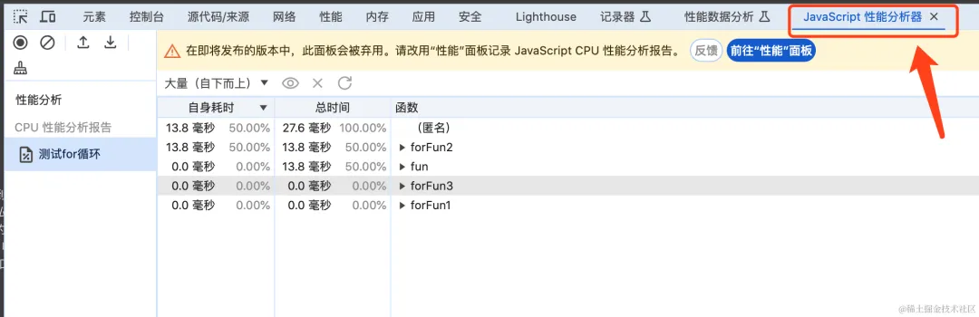 在控制台可以找到这个 javaScript性能分析器,英文  javaScript Profiler, 如果你在自己浏览器找不到, 可能是你没有启动这个试验性功能。