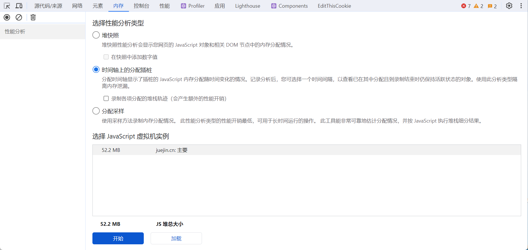 常用主要面板,和网络面板,也可以专门用内存模块分析内存泄漏